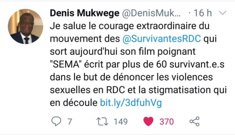 Sur Twitter, le gynécologue congolais, Denis Mukwenge, qui a soigné depuis 1999, plus de 54 000 femmes et enfants victimes de viols, a salué à juste valeur cette initiative.
